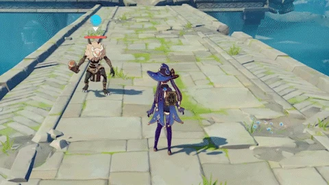 En maintenant la compétence, Mona se propulse rapidement en arrière pour esquiver les attaques tout en invoquant un nouveau mirage du destin. Il ne peut y avoir qu’un seul mirage actif à la fois.